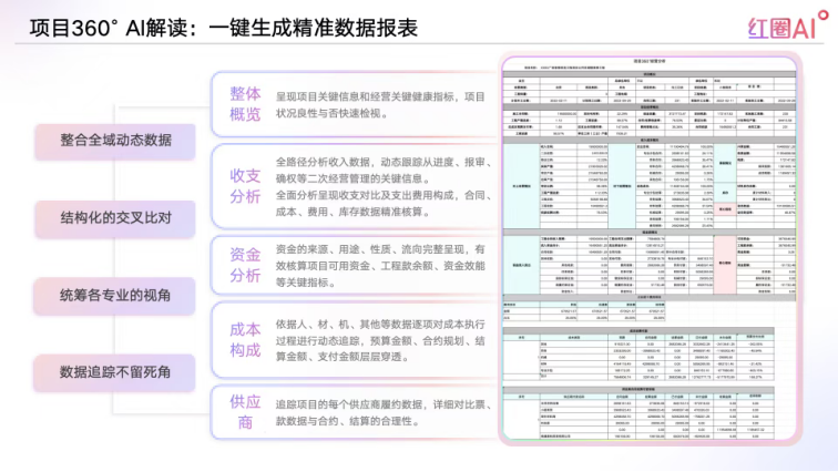 比如項(xiàng)目360°AI解讀,你想了解某個(gè)項(xiàng)目的情況,不用再讓下屬寫報(bào)告——點(diǎn)一下按鈕,系統(tǒng)自動(dòng)生成一份“效益體檢報(bào)告”:資金夠不夠用?成本有沒有超支?進(jìn)度是不是滯后?甚至能告訴你“成本超支是因?yàn)槟撤职填l繁變更合同”,連優(yōu)化建議都給出來。相當(dāng)于給你配了個(gè)“智能參謀”,不用自己扒數(shù)據(jù),問題根因、解決方向全清楚。