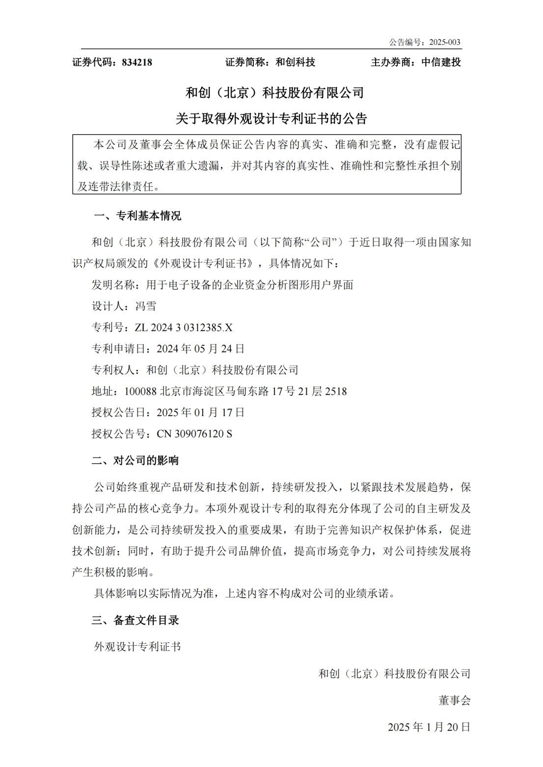 在2025年的新春之際,和創(chuàng)科技以其卓越的創(chuàng)新能力和深厚的技術(shù)底蘊(yùn),迎來了科技研發(fā)的新里程碑——連續(xù)榮獲兩項(xiàng)最新專利認(rèn)證,分別是外觀發(fā)明專利《用于電子設(shè)備的企業(yè)資金分析圖形用戶界面》以及發(fā)明專利《一種數(shù)據(jù)處理方法、裝置及電子設(shè)備》。這兩項(xiàng)專利的取得,不僅標(biāo)志著和創(chuàng)科技在數(shù)字化資金管理領(lǐng)域的又一次重大突破,更為廣大工程企業(yè)用戶帶來了更為高效、便捷的資金管理解決方案。