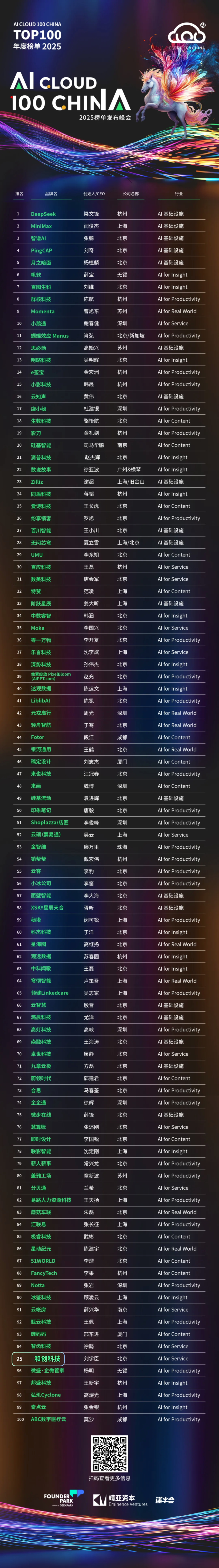 6月22日,中國人工智能與云計(jì)算領(lǐng)域的權(quán)威風(fēng)向標(biāo)《AI Cloud 100 China》2025年度榜單于北京 751 Park 正式發(fā)布,這是靖亞資本和Founder Park、崔牛會(huì)兩位聯(lián)合主辦方合作推出的第四屆榜單。和創(chuàng)(北京)科技股份有限公司(以下簡(jiǎn)稱“和創(chuàng)科技”)憑借在“SaaS + AI”領(lǐng)域的持續(xù)創(chuàng)新與深度應(yīng)用,再次從數(shù)百家Cloud企業(yè)中脫穎而出,登上榜單。