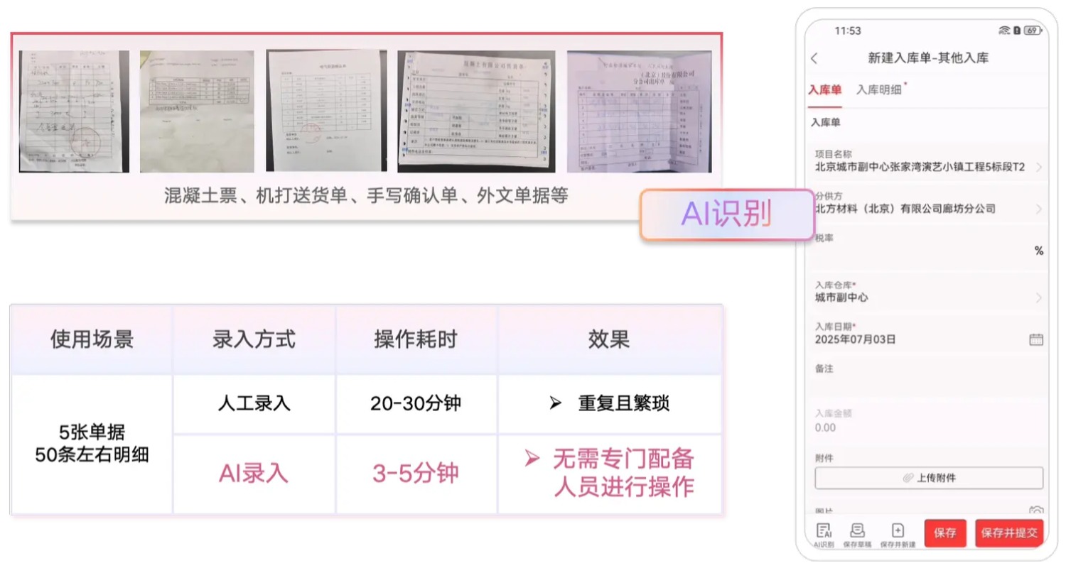 AI錄單助手能夠自動從入庫單中識別出材料的名稱、規(guī)格、數(shù)量等信息,并進行數(shù)據(jù)回填。系統(tǒng)還會在數(shù)據(jù)錄入時進行實時成本預警,確保企業(yè)在采購環(huán)節(jié)能夠精確把控成本。通過AI的輔助,入庫單的錄入時長縮短了80%,而成本控制的準確性提高了20%,極大提高了企業(yè)的資金使用效率。