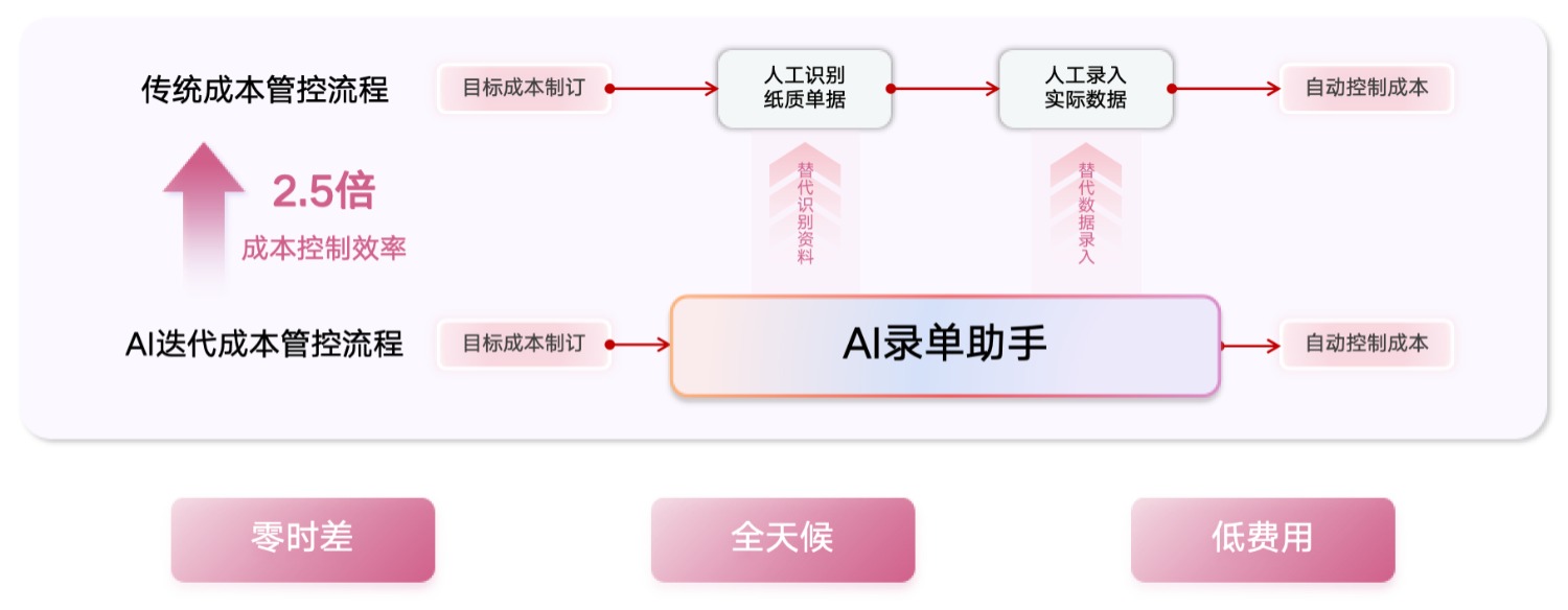 目標成本制訂 → AI錄入助手(替代識別資料、替代數(shù)據(jù)錄入) → 自動控制成本