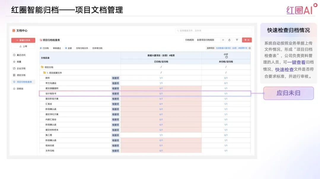 系統(tǒng)自動按照業(yè)務(wù)單據(jù)上傳文件情況,形成“項(xiàng)目歸檔檢查表”,公司負(fù)責(zé)資料管理的人員,可一鍵查看歸檔情況,包括“應(yīng)歸未歸”、“應(yīng)歸已歸”、“已歸未審核通過”等。
