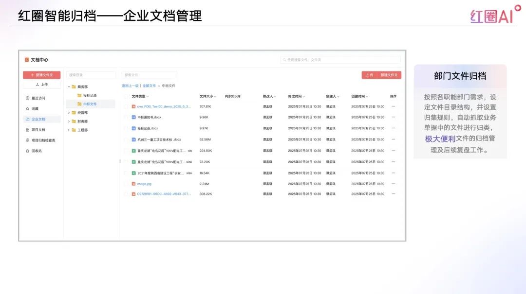 以往投標(biāo)流程中,資料查找和內(nèi)容比對耗時(shí)耗力、風(fēng)險(xiǎn)頻發(fā)。紅圈AI通過快速檢索歷史標(biāo)書、技術(shù)方案、成功案例等內(nèi)容,助力企業(yè)建立專屬“投標(biāo)智庫”,讓策略制定更具數(shù)據(jù)支撐。