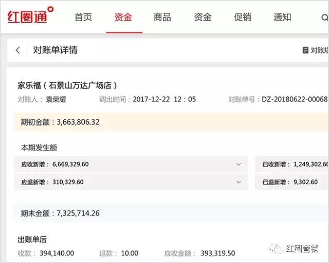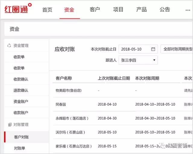 在6.5.3版本,紅圈后臺的資金功能中新增“客戶對賬”,為每個客戶設(shè)定對賬周期、定期生成對賬單。對賬單清晰呈現(xiàn)每個客戶在該對賬周期的應(yīng)收、已收、期末應(yīng)收金額以及發(fā)生金額明細(xì),大大提高對賬效率。