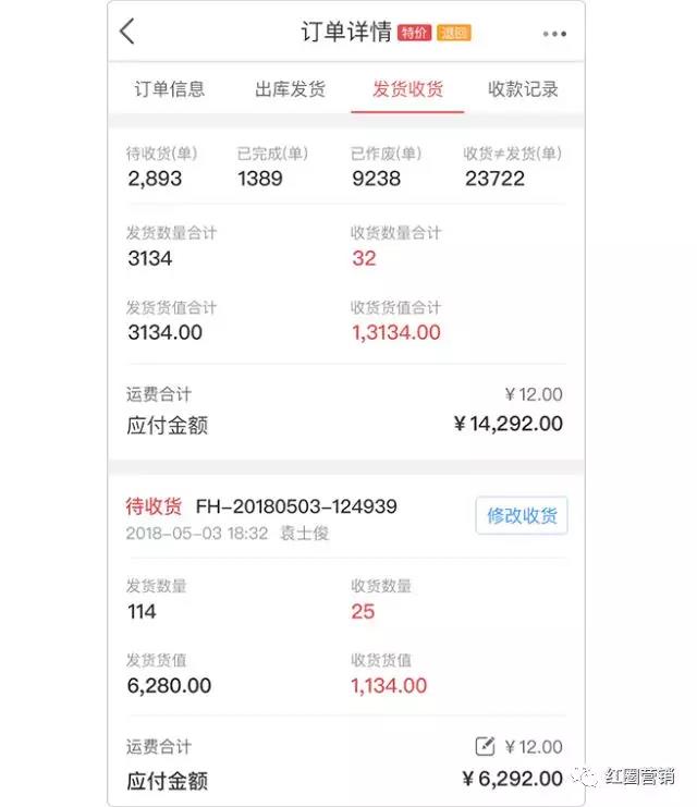 在出貨進(jìn)貨中,由于運輸損耗等原因,企業(yè)發(fā)貨數(shù)量與客戶收貨數(shù)量不同的情況時有發(fā)生,為了便于處理類似的情況,紅圈通特別在訂單詳情頁增加發(fā)貨收貨記錄,支持分別記錄發(fā)貨收貨數(shù)量、單價、金額。